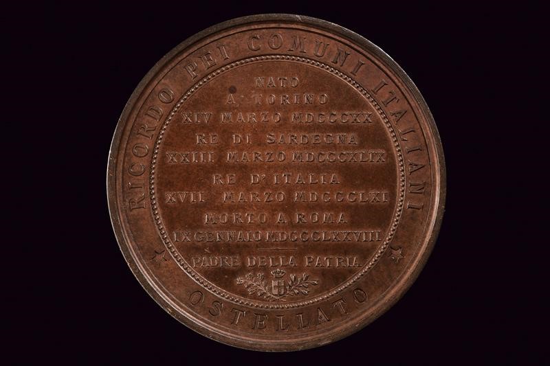 In bronzo. Al dritto busto verso sinistra del re, al bordo "VITTORIO EMANUELE II."; sotto al taglio del collo opus "A RESTELLI INC. / TORINO". Al rovescio nel campo "NATO A TORINO XIV MARZO MDCCCXX RE DI SARDEGNA XXIII MARZO MDCCCXLIX RE D'ITALIA XVII MAR