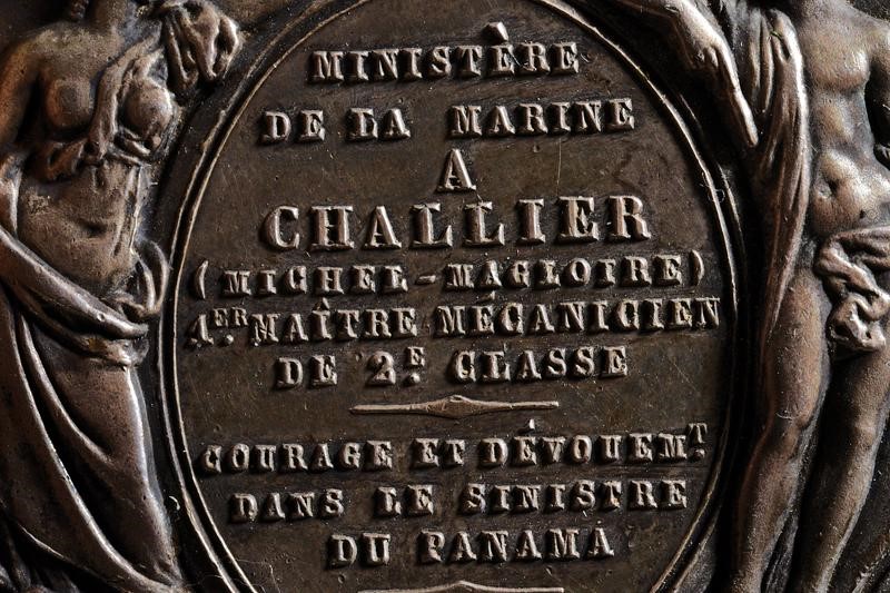 Sul recto "RÉPUBLIQUE FRANÇAISE" in corona di foglie di quercia. Sul retro allegorie in bassorilievo con scudetto ovale al centro "MINISTÈRE DE LA MARINE A CHALLIER (MICHEL-MAGLOIRE) 1ER MAÎTRE MÉCANICIEN DE 2.E CLASSE COURAGE ET DÉVOUEMT DANS LE SINISTRE