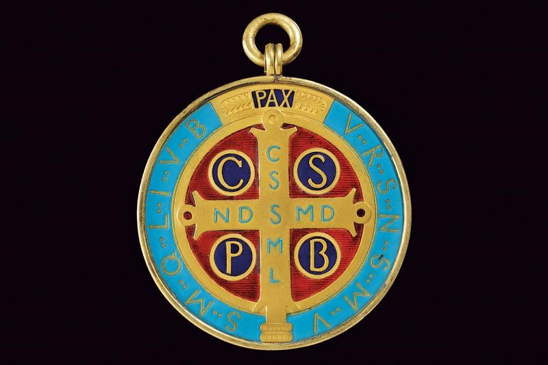 Di forma circolare, in argento dorato e smaltato. Con anello di sospensione. 53 g.