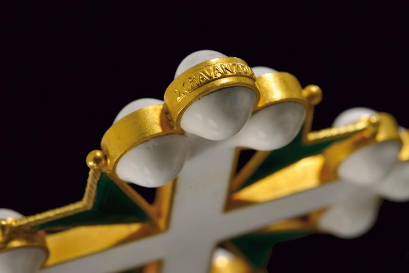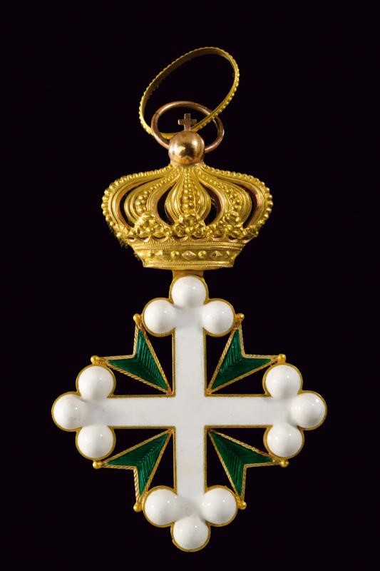 Croce da commendatore, in oro con smalti, sotto corona e con passante per il nastro da collo. Il braccio inferiore marcato "D. CRAVANZOLA".