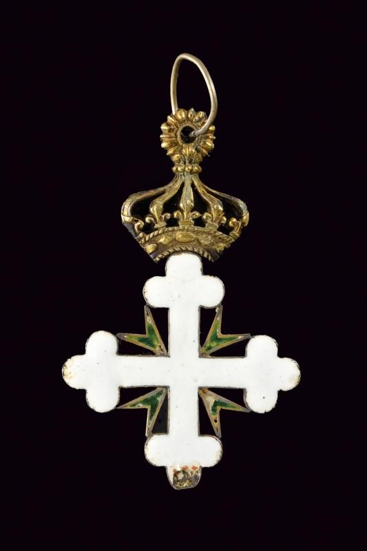 Croce da cavaliere. Interessante esemplare piatto, in metallo smaltato (due chip) con corona fissa traforata. Molto raro.