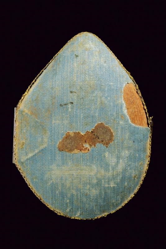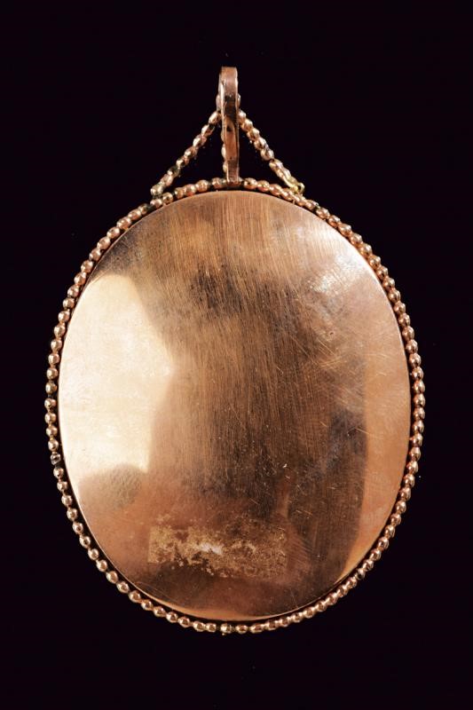 Miniatura di forma ovale, recante effige dipinta in policromia di San Giuseppe con il Bambino Gesù e la Verga Fiorita. Sotto vetro e in cornice perlinata in metallo dorato. In astuccio originale in legno rivestito con resti di velluto celeste (molto liso