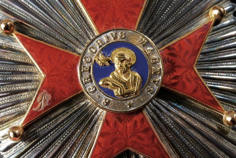 Ordine di San Gregorio Magno, placca da commendatore in argento, a raggi, al centro oro e smalti (chip); i bracci, sotto allo smalto, sono in color rosso ed incisi a motivi floreali Sul retro spilla verticale.