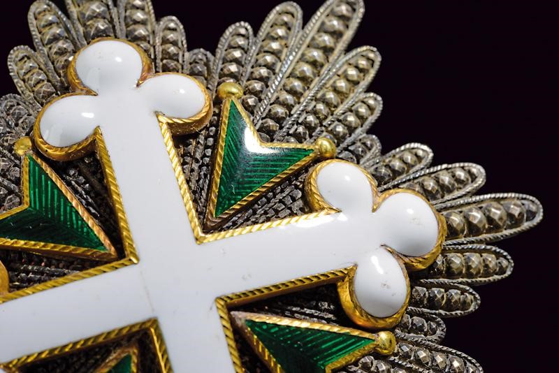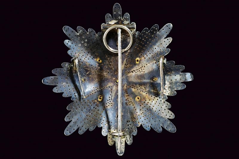Placca di Gran Croce dell'ordine dei Santi Maurizio e Lazzaro, in argento brillantato e traforato, la croce in oro e smalti. Il retro con spilla verticale, ai lati due graffe.