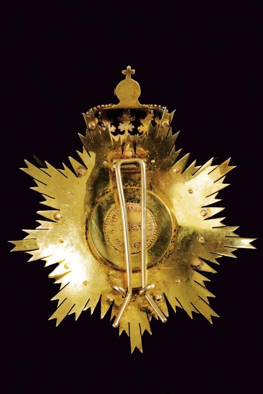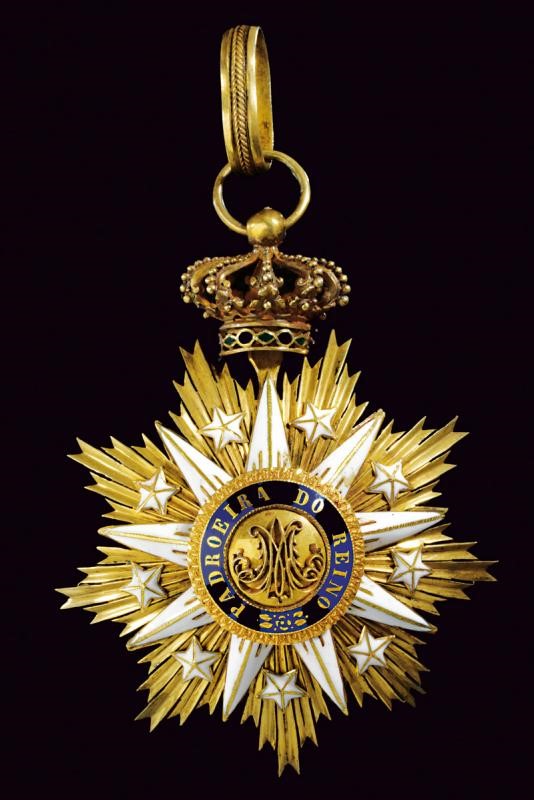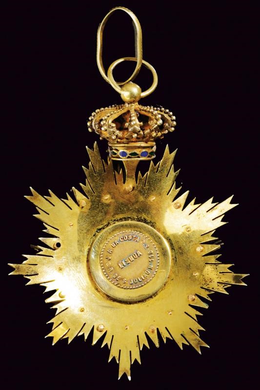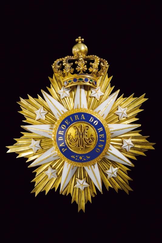 Set di gran croce dell'ordine dell'Immacolata concezione di Vila Viçosa, donato al tenore Francesco Tamagno. In argento dorato. Struttura di base a raggi scanalati a nove punte, al di sopra di questa raggi e stelle in smalto bianco, centralmente entro una