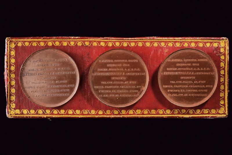 Per la visita della Duchessa di Lucca, Maria Luigia, alla Zecca di Napoli. Al recto testa con corona a destra in altorilievo con iscrizione "FERDINADVS I. D. G. REGNI SICILIARVM ET HIERVSALEM REX P. F. A.". Al verso iscrizione "ALOYSIA. BORBONIA.REGINA/LV