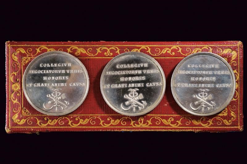 Testa del re a destra. Iscrizione VITTORIO EMANUELE II RE D'ITALIA". sul retro iscrizione "COLLEGIVM / NEGOCIATORVM VRBIS / HONORIS / ET GRATI ANIMI CAVSA". 36 g ognuna. In astuccio originale.
