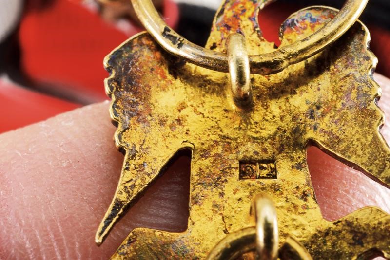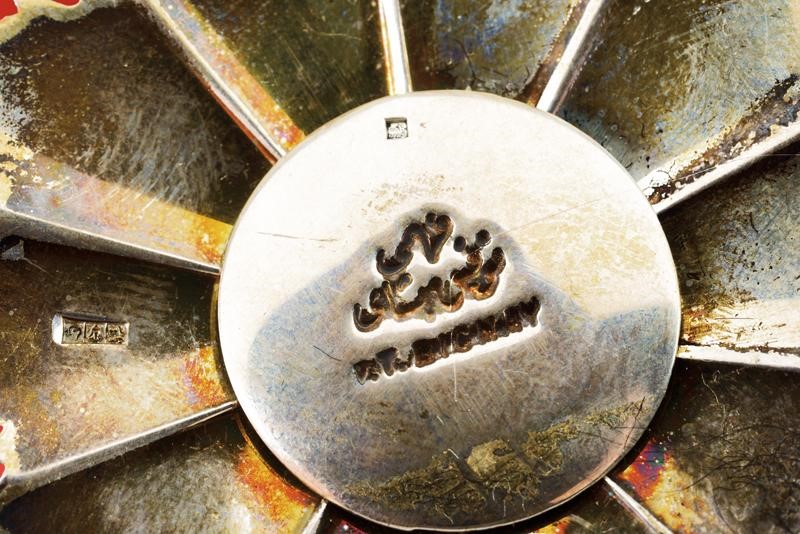 Pendente di gran croce in argento e smalti, sul retro vari punzoni. Completo di sciarpa.