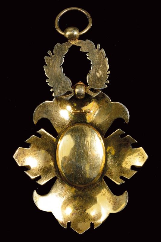 Croce da collare di Gran Ufficiale, in metallo dorato e smaltato. Completo della corona di lauro.