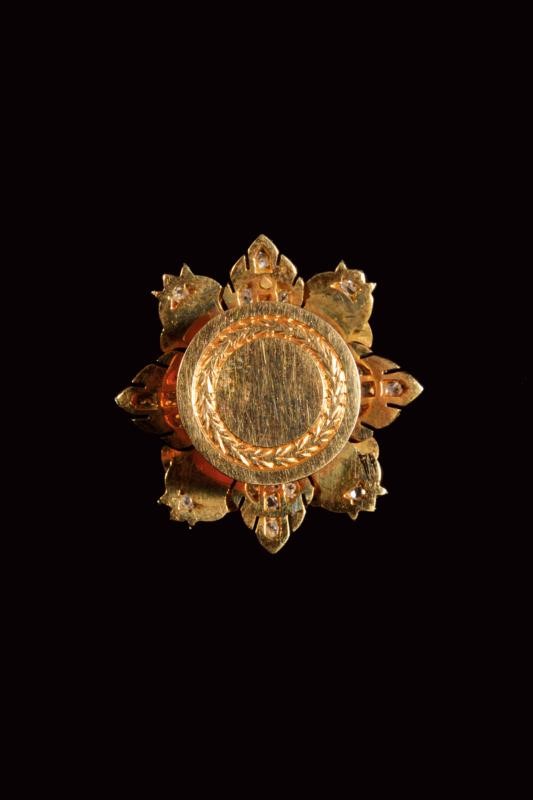 Bellissima miniatura in oro, diamanti taglio rosetta e smalti. Sul retro bottone di fissaggio.