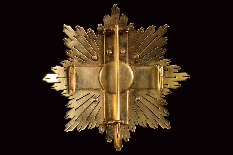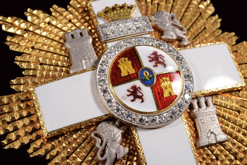 Placca con distintivo bianco di terza classe. La piastra in oro giallo brillantata e traforata, caricata con la croce bianca recante il medaglione con l'armi di Castiglia e Leon, questo con il bordo arricchito da diamanti taglio a rosetta; in alto la corona con una barra rettangolare con diamanti. Fra i bracci della croce ripetuti la torre e il leone in argento. Il retro con spilla verticale tra due ganci. 58 gr. (18k). Di altissima qualità.