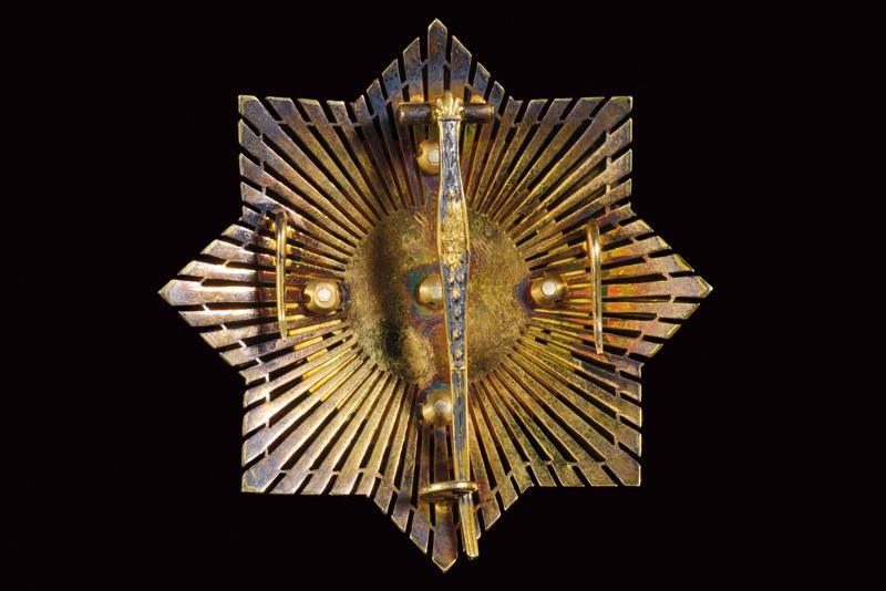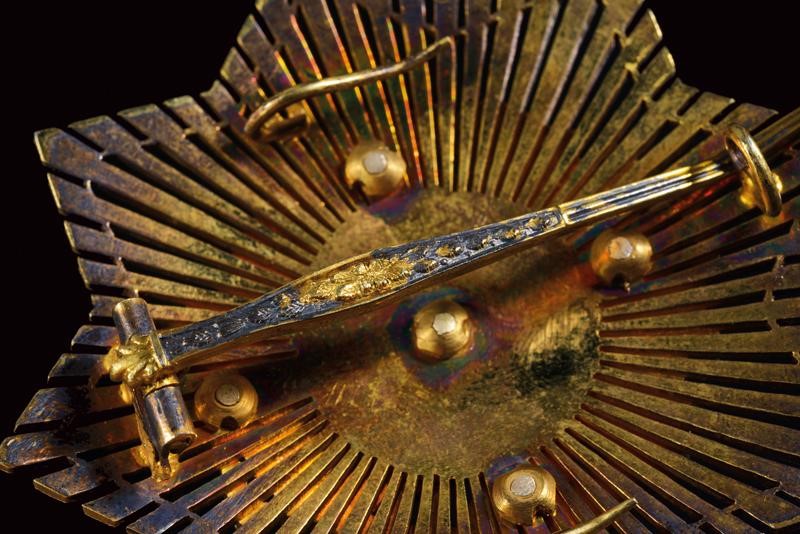 Placca di Gran Croce in argento dorato e smaltato. Sul retro spilla verticale incisa e con due ganci sui lati.