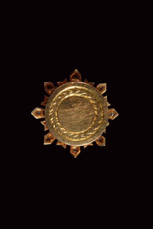 In oro con diamanti taglio rosetta, oro e smalti. Sul retro bottone per il fissaggio. Di buona qualità.