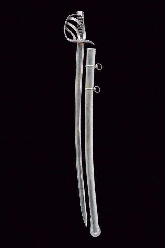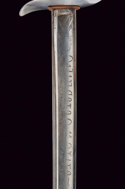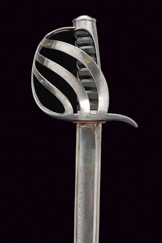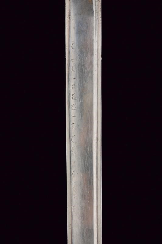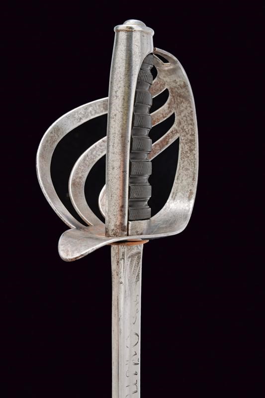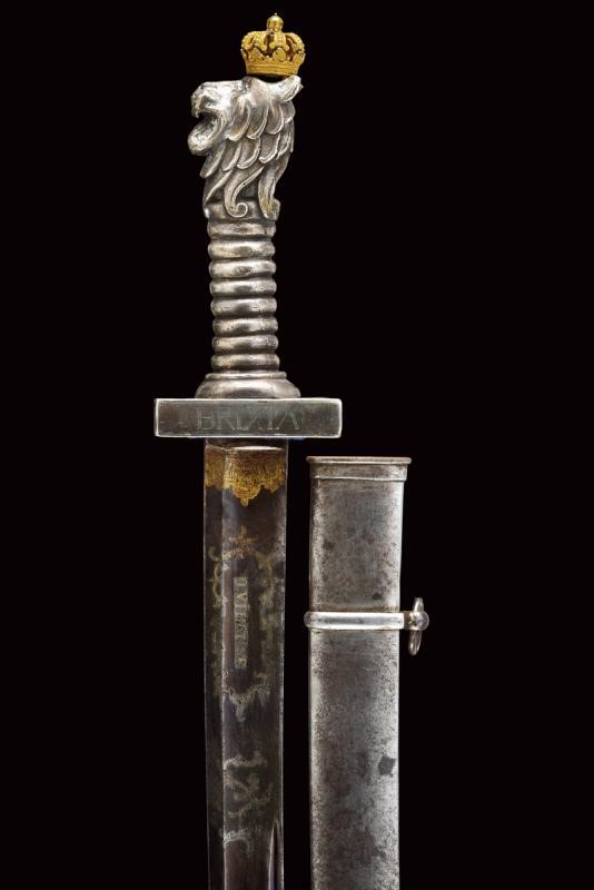 Lama leggermente curva a un filo, pi˘ antica, d'epoca preunitaria, punta e e breve controfilo, sgusciata e con sottile scanalatura accanto al dorso, sul lato di terza resti di iscrizioni non pi˘ leggibili, su quello di quarta il motto "O VINCERE O MORIRE" e resti di un trofeo. Fornimento in ferro a quattro rami di guardia, con resti di marcature non chiaramente leggibili. Cappetta lunga liscia. Impugnatura in ebano in settori zigrinati. Fodero in ferro a due campanelle.