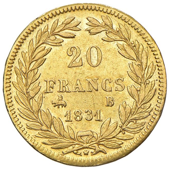 20 franchi 1831, Rouen. Bordo in rilievo. Gadoury 1030a. ORO, gr. 6,45 c. NC. Lieve colpetto sul bordo. SPL