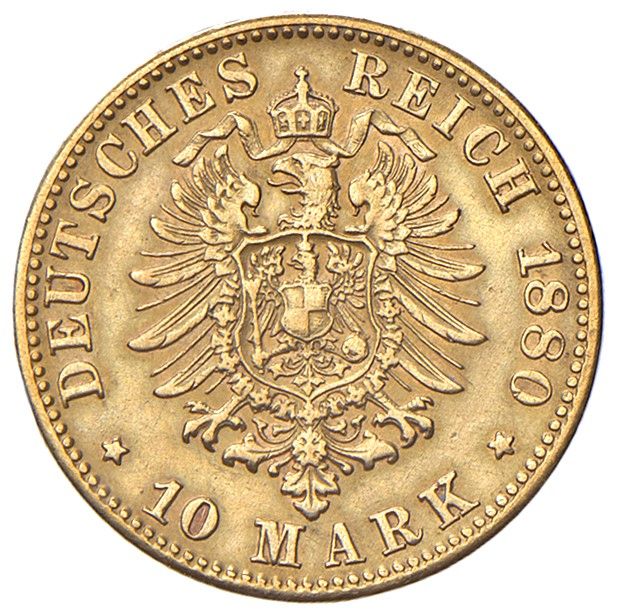 10 marchi 1880. KM 624. ORO, gr. 3,98 c. MB/BB