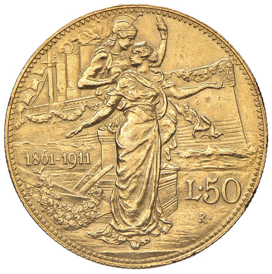 50 Lire 1911, Cinquantenario Unità d'Italia. Pagani 659. Montenegro 34. ORO, gr. 16,10. BB/SPL