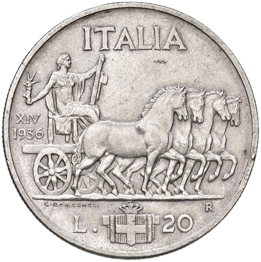 20 lire 1936, Impero. Pagani 681. Montenegro 78. AG. Rara. BB/SPL