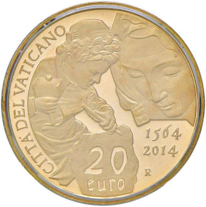 20 euro 2014, 450° anniversario della morte di Michelangelo. ORO, gr. 6, titolo 917. In astuccio. PROOF