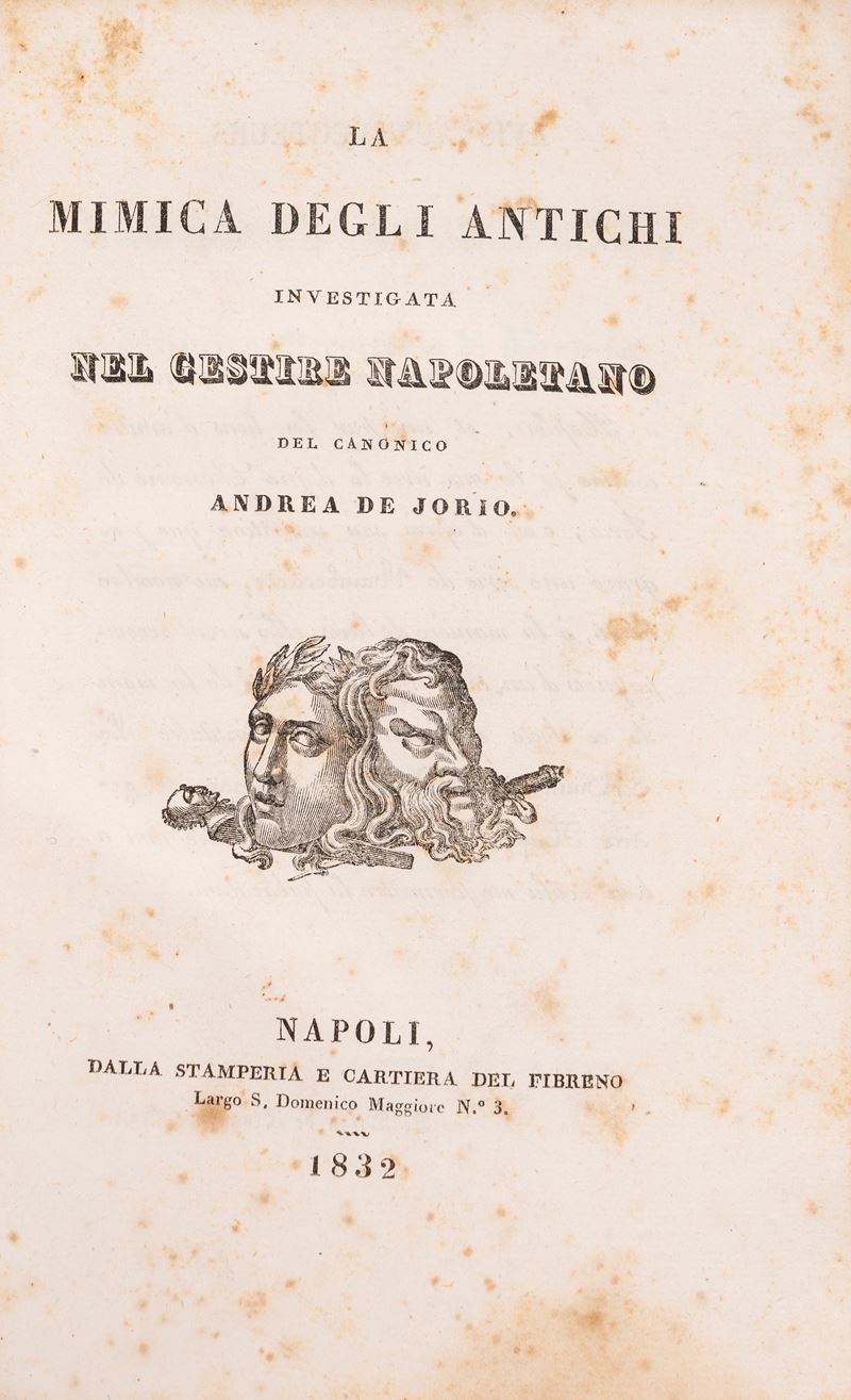 Prima edizione, di questo studio approfondito, pregiato ed unico in materia, di notevole interesse anche per le affinità con la gestualità dell'arte drammatica. Il canonico napoletano A. De Jorio fu un profondo conoscitore dell’archeologia e della storia patria e, oltre all’opera qui presentata, autore di numerosi studi e guide, in particolare dedicati a Pozzuoli, città nella quale trascorse gran parte della sua vita.