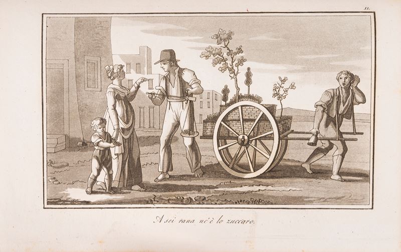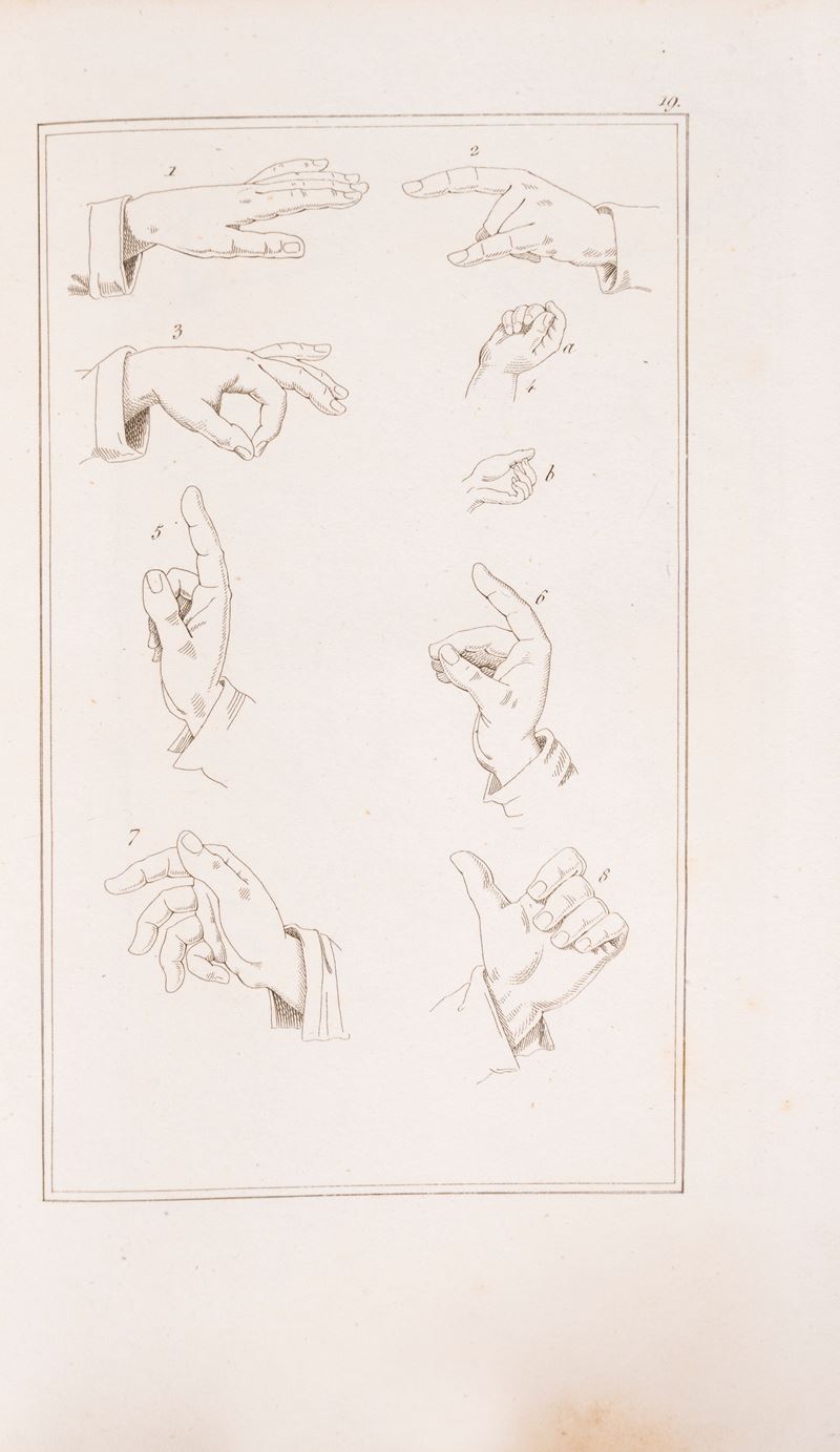 Napoli, Dalla stamperia e cartiera del Fibreno, 1832. In 8°.  Frontespizio entro cornice, 21 tavole di cui 16 a opera di Gaetano Gigante ed incise all'acquatinta da le Baron de Clugny de Nuis, raffiguranti scene popolari esemplificative per la conoscenza della mimica e della gestualità nella comunicazione verbale dei Napoletani; le altre 5 tavole sono al tratto e raffigurano gesti di personaggi dell'antica Grecia, la varia posizione delle dita nell'indicazione di numeri e di particolari messaggi espressivi. Fioriture sparse. Legatura in mezza pelle e piatti marmorizzati con titolo scritto al dorso e decori. Ex libris al contropiatto "Mayor Bryan Palmes".