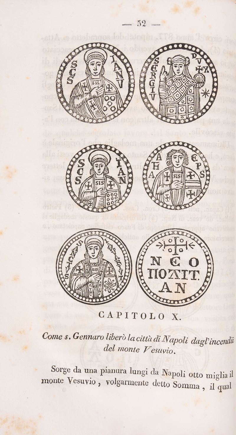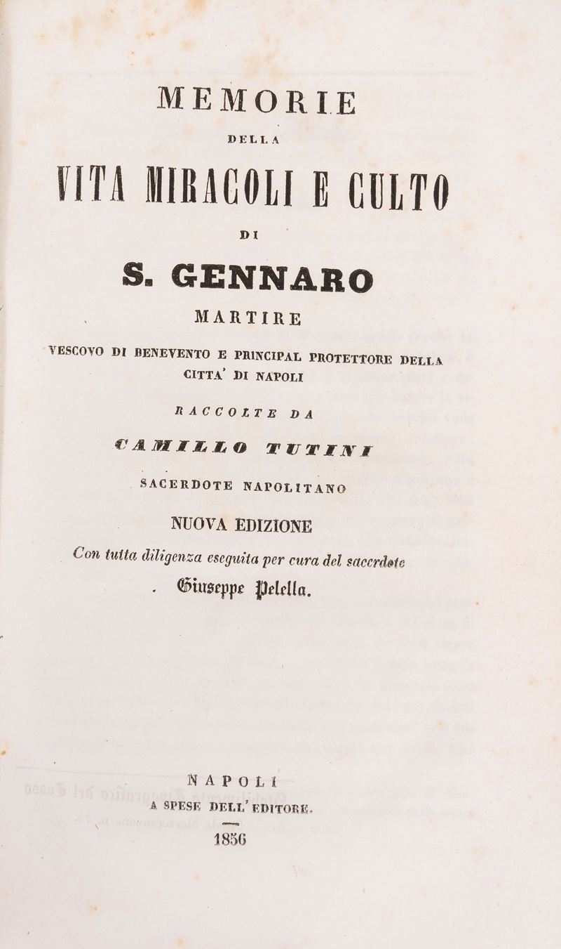 Napoli, Stamperia Tramateriana, 1836. In 2°. Fioriture e aloni, legatura moderna in mezza tela beige e cartone. § Camillo Tutini. Memorie della Vita Miracoli e Culto di S. Gennaro Martire. Napoli, a spese dell'editore, 1856. In 8°. Incisioni nel testo alle pp.51-52, fioriture, legatura coeva in mezza pelle marrone.