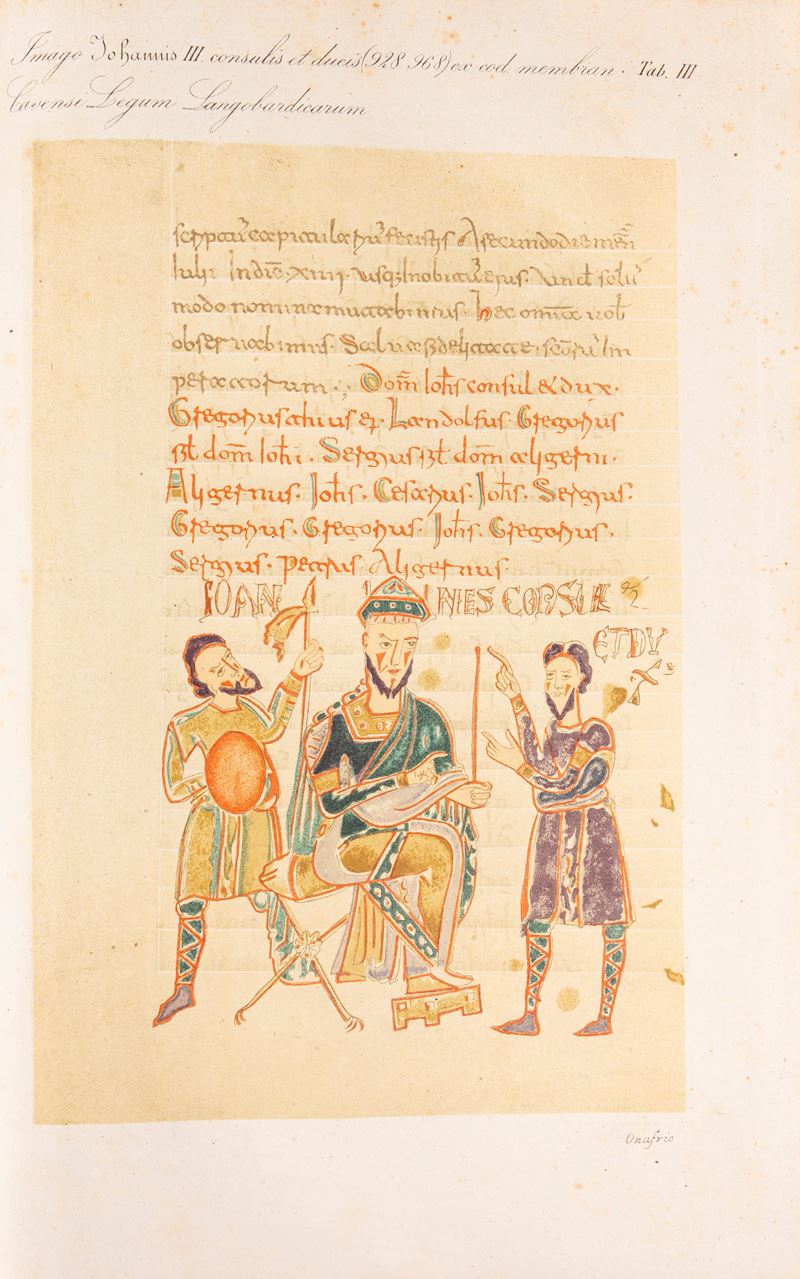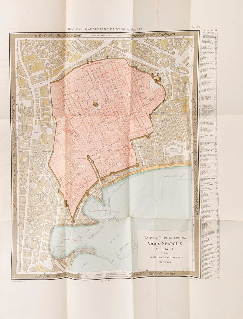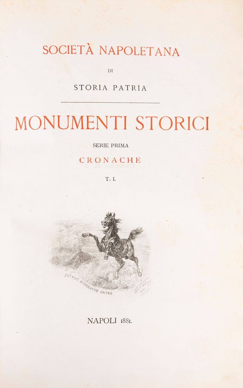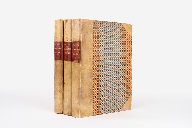 Napoli, Società Napoletana di storia Patria [Giannini], 1881-1892. In 2°. 3 voll. Frontespizi in rosso e nero, con 21 tavole numerate da I a XX (presente una tavola XIX bis), di cui alcune ripiegate e due mappe ripiegate, rare lievi fioriture, legature coeve in mezza pergamena con angoli e carta decorata, titoli in oro entro tassello al dorso, lievi difetti.