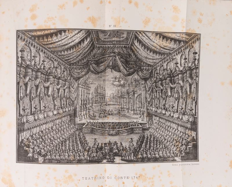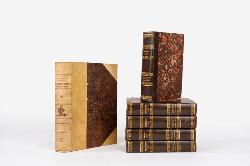Napoli, Luigi Pierro, 1891. In 8°. Occhietto, illustrazione al frontespizio, 4 tavole ripiegate in fine al volume (montate al contrario), leggera brunitura, legatura in mezza pelle con angoli, titoli al dorso. § Insieme nel lotto Signorelli, P. Storia critica dei teatri antichi e moderni. Napoli, Orsino, 1813. In 8°. 10 parti in 5 tomi. Fioriture e bruniture, alcune tracce di umidità. Legature coeve in mezza pelle e carta marmorizzata, lievi difetti.