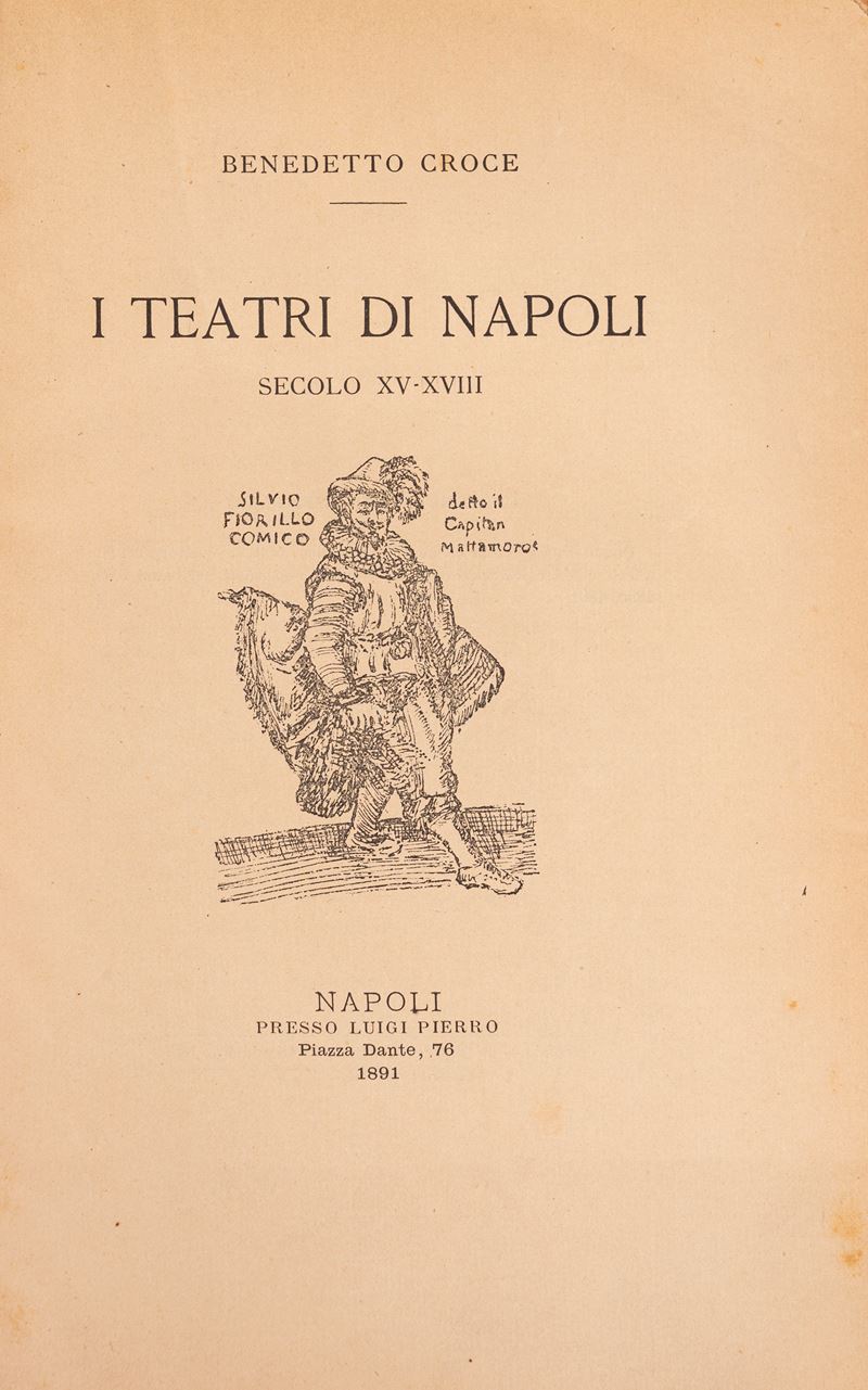 I opera: Prima edizione, rara, di questa raccolta di saggi di Benedetto Croce precedentemente pubblicati sull’«Archivio Storico per le Province Napoletane». L'antologia presenta per la prima volta un vasto corpus di materiali in larga parte inediti dedicati alla storia e alla vita teatrale di Napoli.