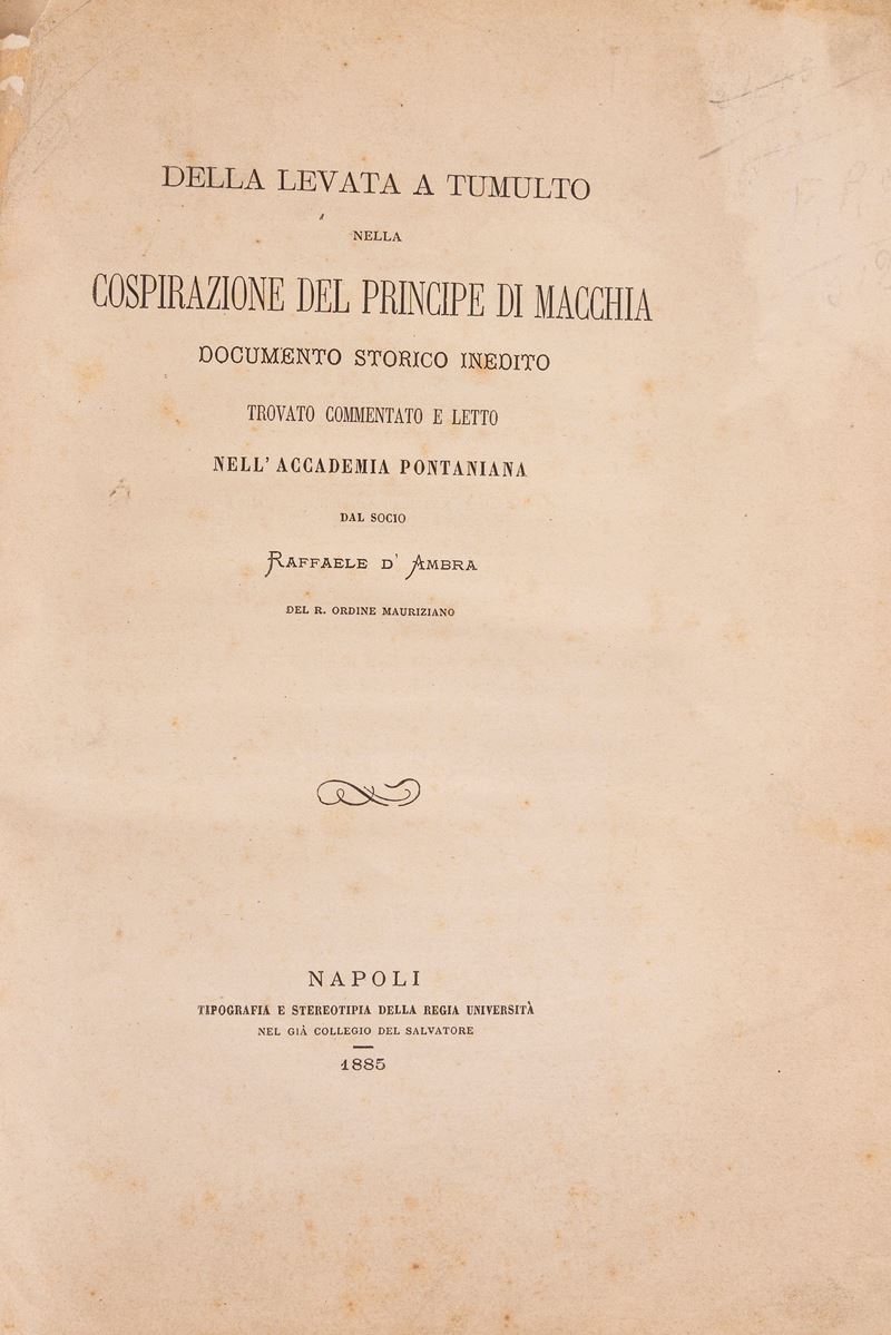 Napoli, Morano & Figlio, 1899. In 2°. Con LXXV tavole, lieve brunitura, legatura in cartone rigido decorato, piatto staccato, difetti al dorso. § D'Ambra, R. Della levata a tumulto nella cospirazione del Principe di Macchia, Napoli, Tipografia e stereotipia della Regia Università, 1885. In 2°. Leggera brunitura, qualche fioritura, legatura contemporanea in cartoncino grigio, qualche difetto. Dedica dell'Autore al Conte e giurista Pasquale Stanislao Mancini al frontespizio.