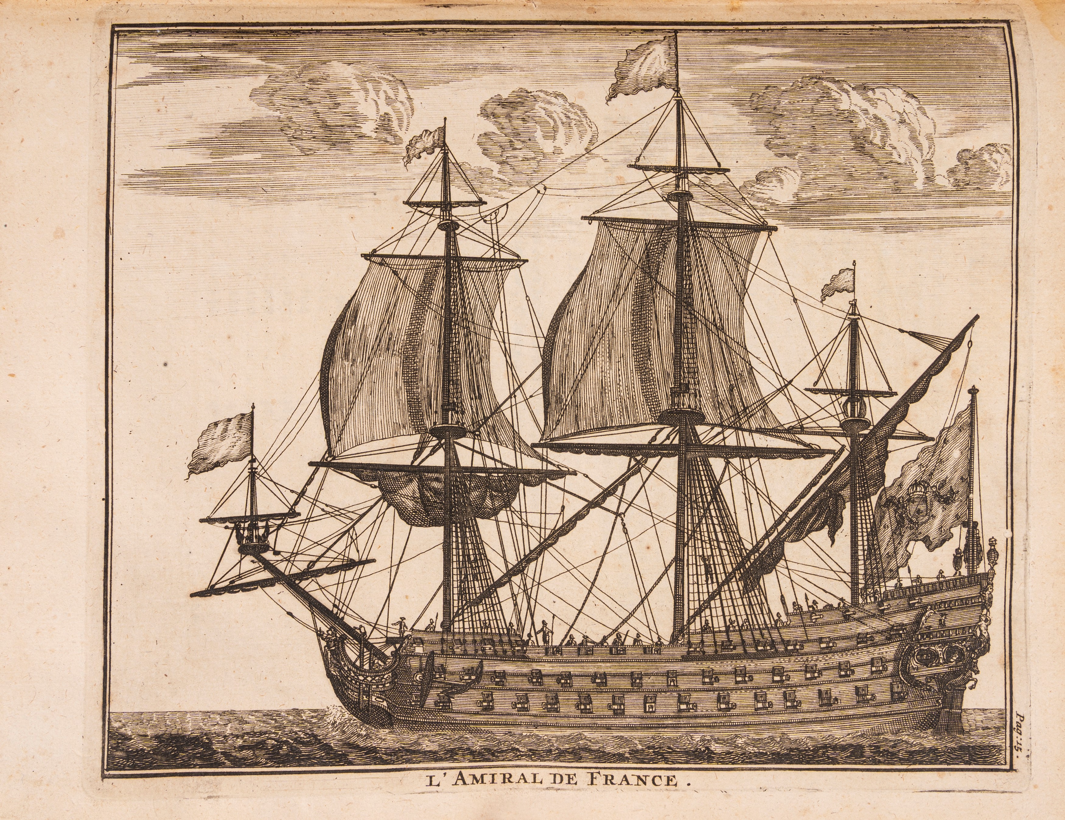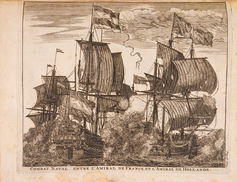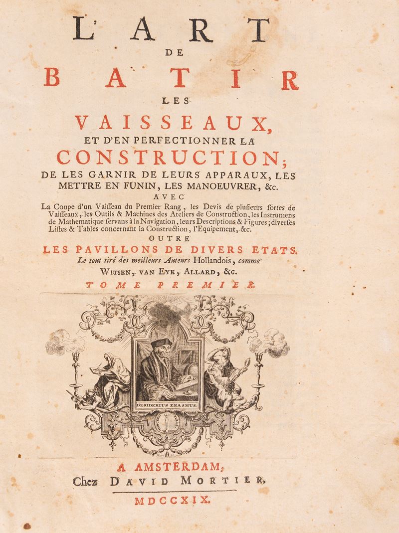 Rarissima prima edizione francese che raccoglie e rielabora i più celebri scritti di autori olandesi in tema di architettura navale. L'opera ha un ricchissimo apparato iconografico che descrive vascelli, utensili, operazioni di calafataggio, nonchè le bandiere delle marine, tra cui alla tavola 37 anche i "Pavillon de Naples"e "Pavillon des deux Siciles".