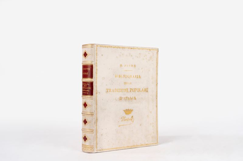 Napoli, dalla tipografia De marco, 1841. In 4°. Due parti in un volume. Antiporta incisa in rame da Masini, disegnata da d'Onofrio, diverse illustrazioni nel testo opera di Masini, Ciccarelli, Gajassi, Porcelli, Balbi, Mancinelli e altri, lievi fioriture, legatura coeva in piena tela con decorazioni dorate al dorso. § Giuseppe Pitrè. Bibliografia delle tradizioni popolari d'Italia. Torino-Palermo, Carlo Clausen, 1894. In 4°. Conservata la brossura editoriale entro sontuosa legatura in piena pergamena realizzata per la biblioteca Natoli, con suo ex libris al contropiatto.