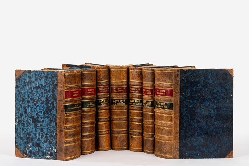 Napoli, Stamperia Simoniana, 1806-1877. In 8°. 81 voll. Dal 1806 al 1815 intitolato "Bollettino delle Leggi", dal 1815 al 1877 intitolato "Collezione delle leggi", mancante l'anno 1837. Condizioni buone, legatura in mezza pelle marrone e cartone con titolo in oro entro tasselli al dorso, tagli gialli, qualche lieve difetto.
