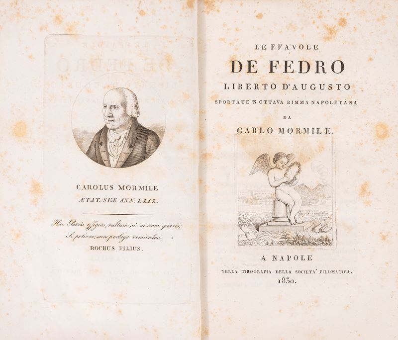 Napoli, 1872. In 8°. Legatura in cartoncino rigido, titoli ai piatti, dorso in tela verde, lievi difetti. Insieme nel lotto altri due testi dedicati al dialetto napoletano: Mormile, Carlo. Le Ffavole de Fedro, Napole, Società FIlomatica, 1830 e Piccinni, Mineco. Dialochielle, favolelle e autra mmesta de poetece componemiente, Napoli, società tipografica, 1820. (solo tomo 2).