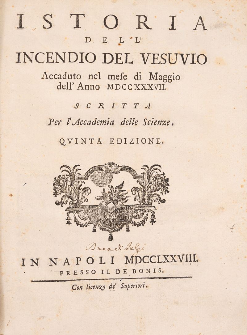 Napoli, presso Il De Bonis, 1778. In 4°. Marca tipografica al frontespizio e nota manoscritta, capilettera incisi, due carte ripiegate incise in ramee fine volume, una dal titolo "Vesuvii prospecctus ex aedibus regiis", l'altra "Vesuvius a vertice dissectus". Legatura in piena pergamena coeva e titolo in oro al dorso. Fioriture sparse. Ex libris al contropiatto "Francisci Carafae ducis de Forli e comitis Policastri"