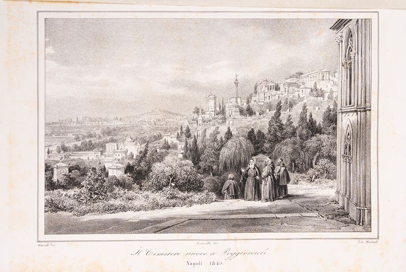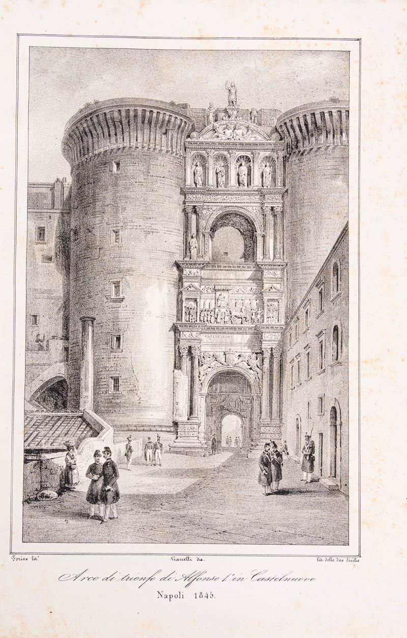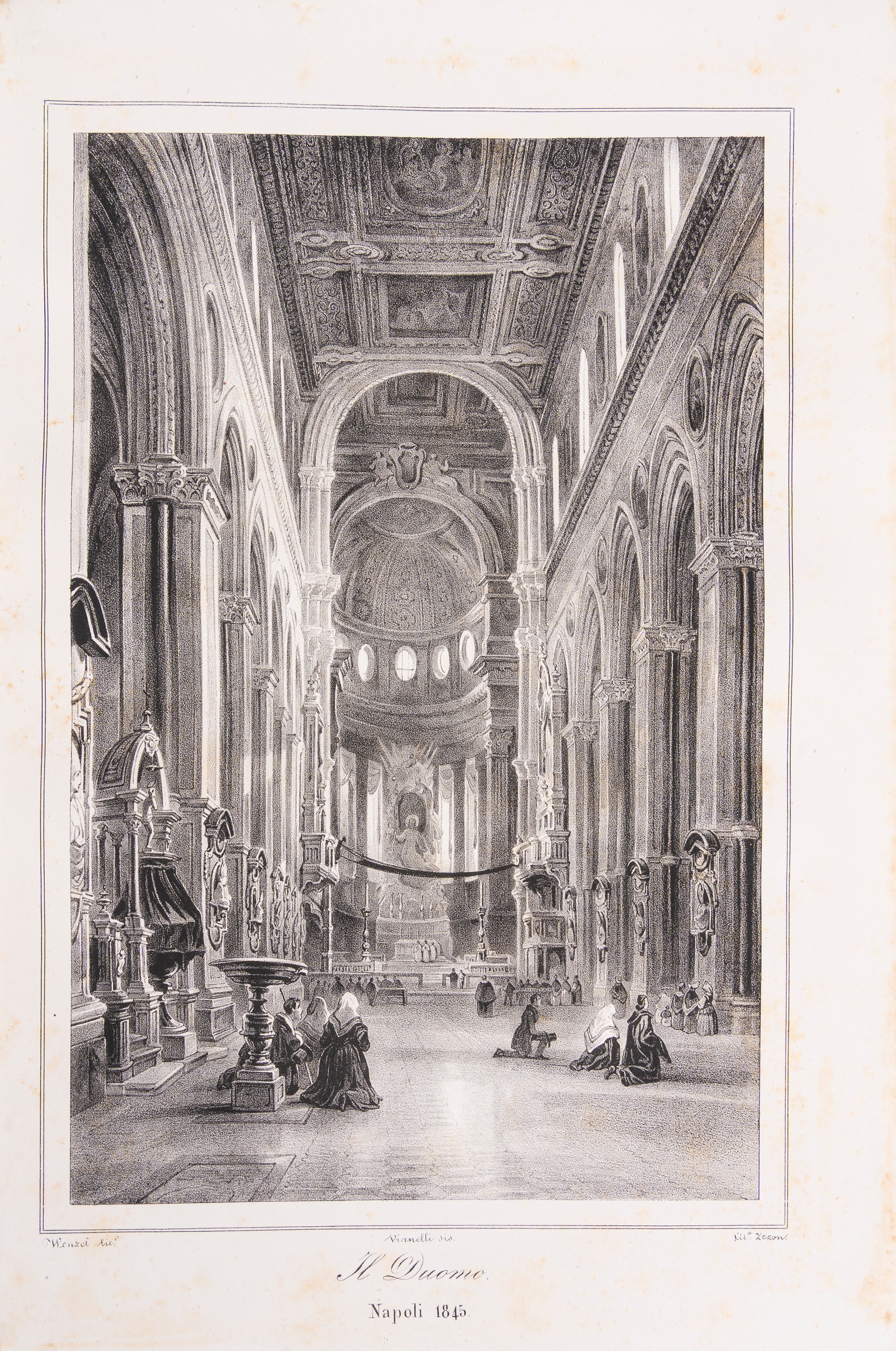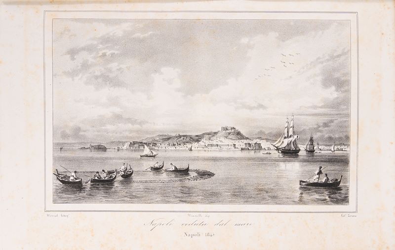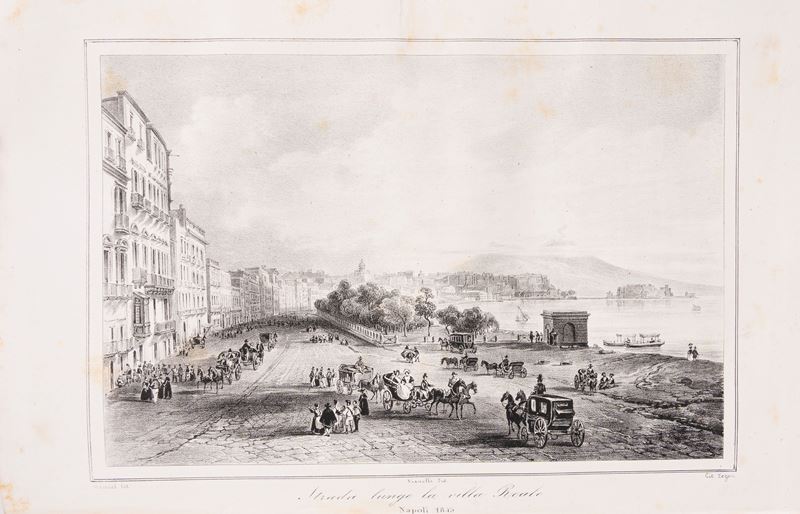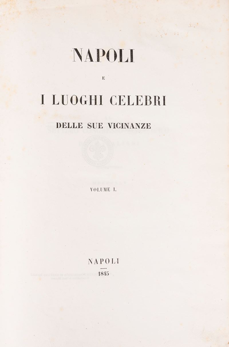 Napoli, Stabilimento tipografico Gaetano Nobile, 1845. In 8° grande. 2 voll. Con 25 tavole litografiche fuori testo protette da velina, 3 carte topografiche ripiegate, quella di Napoli con confini colorati a mano, lievi fioriture, legatura in cartonato editoriale con titolo ai piatti entro ampie ricche cornici in inchiostro blu, dorso del 2 volume parzialmente staccato, lievi difetti.