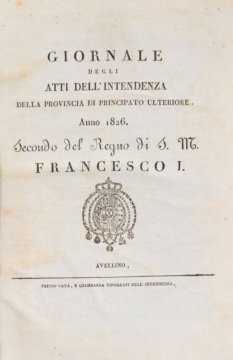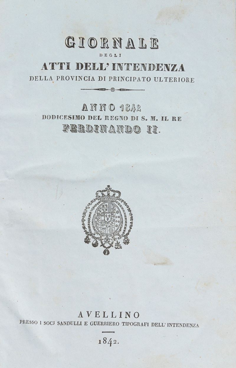 Avellino, presso Cava, E. Giambarba tipografi dell'intendenza, 1826. Stampa tipografica al frontespizio, due carte ripiegate. Legatura in mezza pelle e titolo manoscritto al dorso. § Giornale degli atti dell'intendenza, Avellino, Presso i soci Sandulli e Guerriero Tipografi dell'intendenza, 1842. In carta azzurrina, stampa tipografica al frontespizio. Legatura in mezza pelle e titolo manoscritto al dorso; Giornale degli atti dell'intendenza, Avellino, Presso i soci Sandulli e Guerriero Tipografi dell'intendenza, 1843. In carta azzurrina, stampa tipografica al frontespizio. Legatura in mezza pelle e titolo manoscritto al dorso.