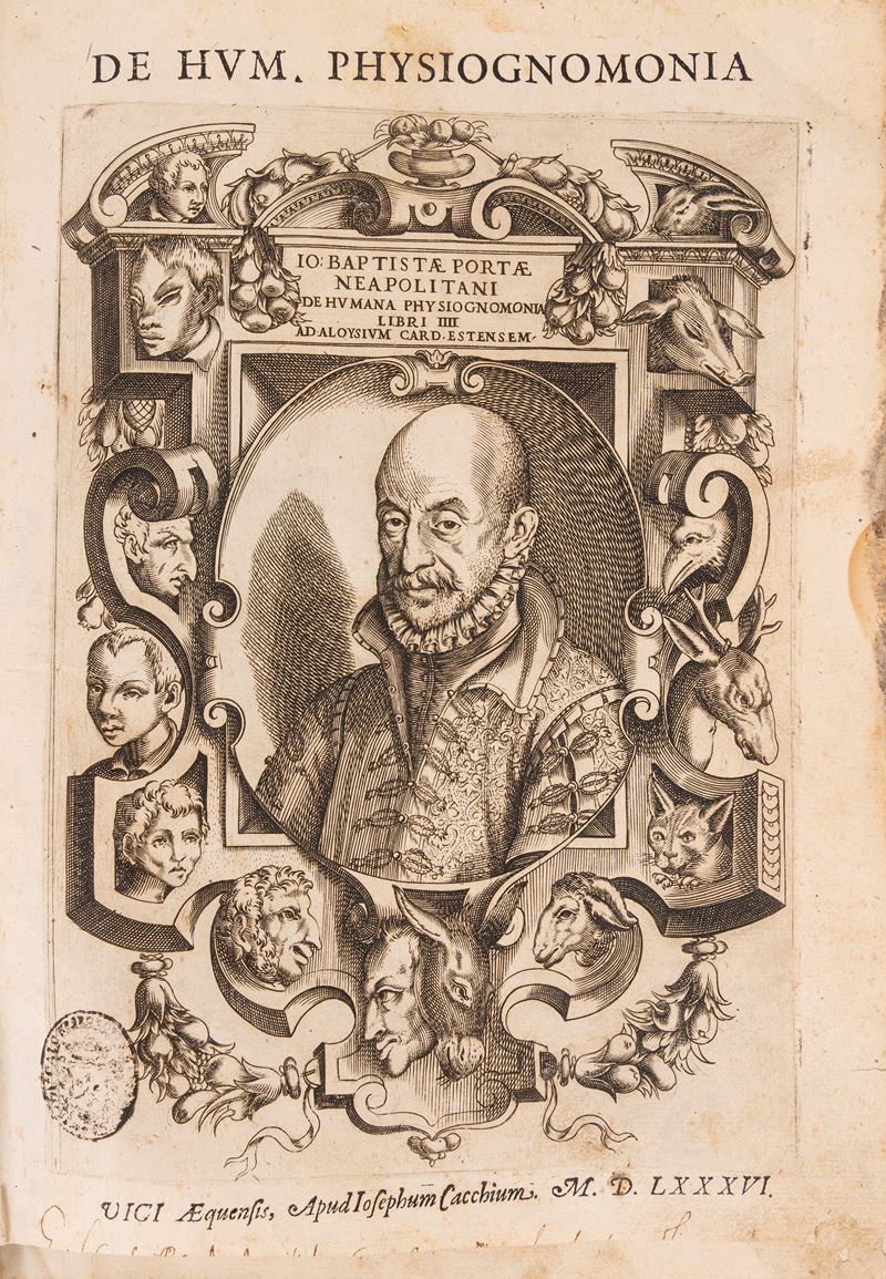 Rarissima edizione originale, stampata a Vico Equense, in cui il filosofo e alchimista napoletano Giovanni Battista Della Porta (1535-1615) espose le sue teorie fisiognomiche, in qualche modo precorrendo gli studi etnologici di Johann Kaspar Lavater circa due secoli più tardi. Dal punto di vista tipografico, una straordinaria testimonianza della vivacità dell'editoria meridionale del sec. XVI anche nei piccoli centri provinciali.