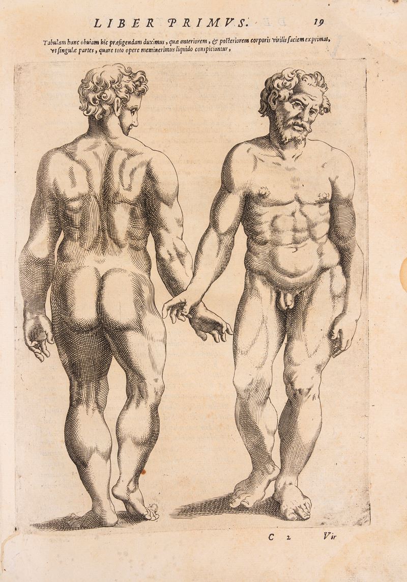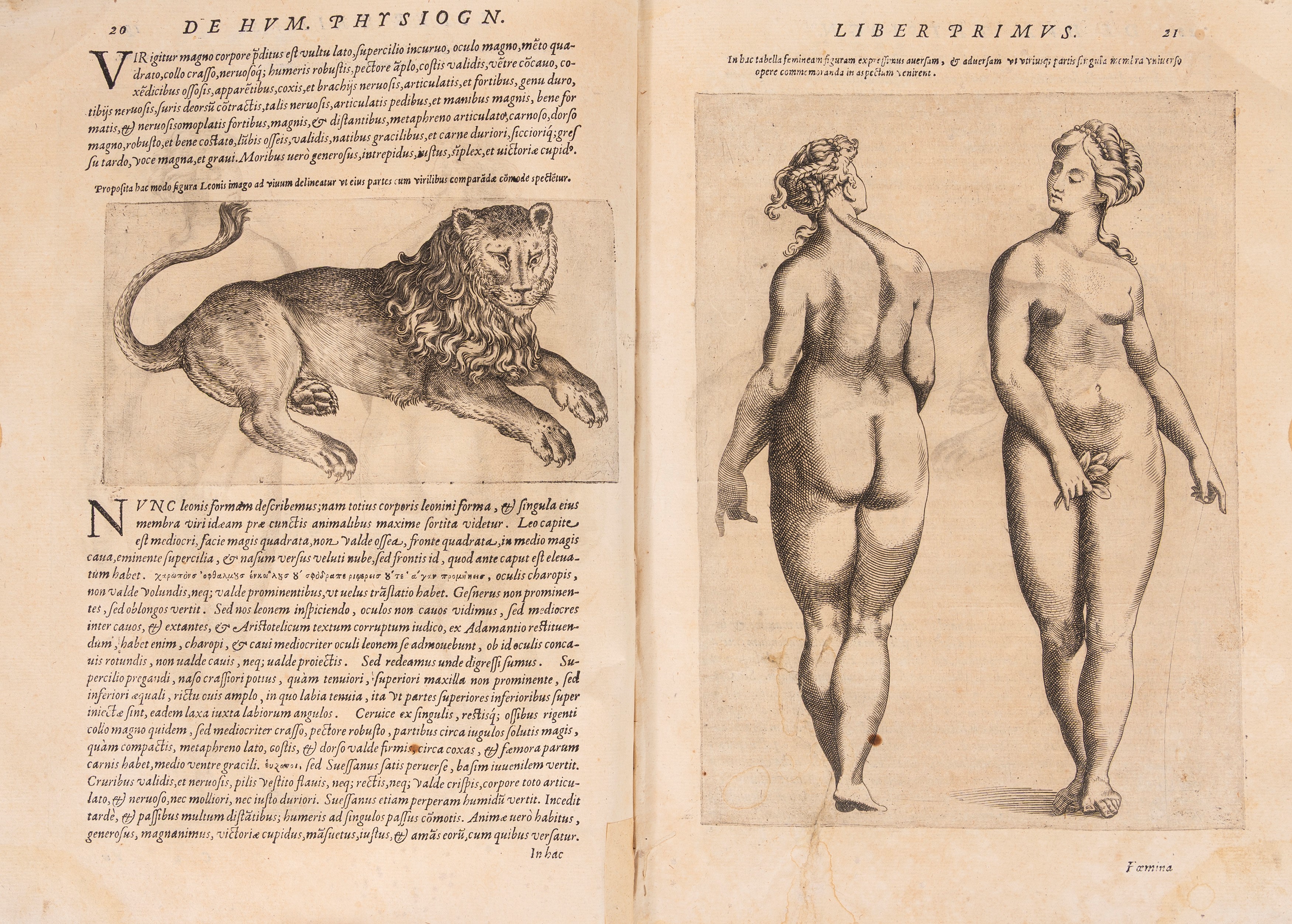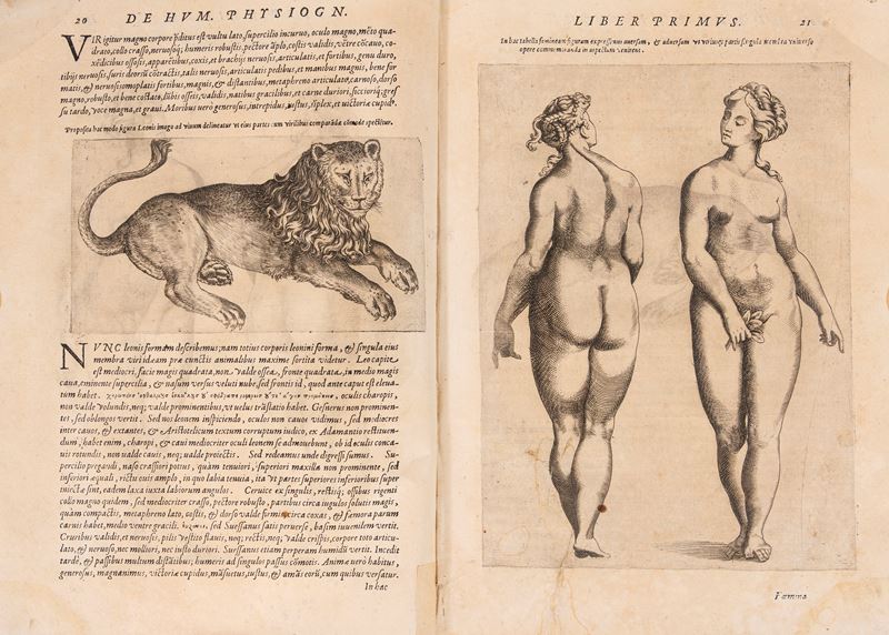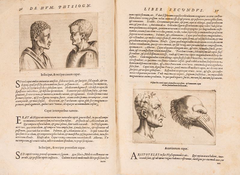 Vico Equense, Giuseppe Cacchi, 1586. In folio. Frontespizio architettonico con ritratto dell'Autore contornato dai principali esempi di fisionomie umane e animalesche studiate nel testo, ritratto del dedicatario il Cardinale Aloisio Estense a piena pagina, 2 incisioni a piena pagina di un uomo e di una donna (ripetute), 81 incisioni nel testo (incluse numerose ripetizioni), margine inferiore del frontespizio rifilato, qualche piccolo restauro, lievi fioriture e arrossature, legatura coeva in mezza pelle, segni si usura in particolare ai bordi. Custodia in tela e cartoncino marrone. Timbri di appartenenza arcivescovili al frontespizio, alla seconda carta e in fine. Ex libris cartaceo al contropiatto.