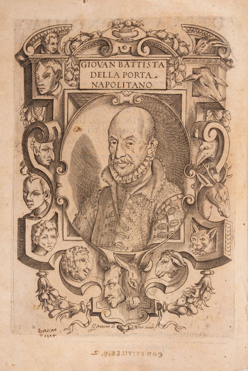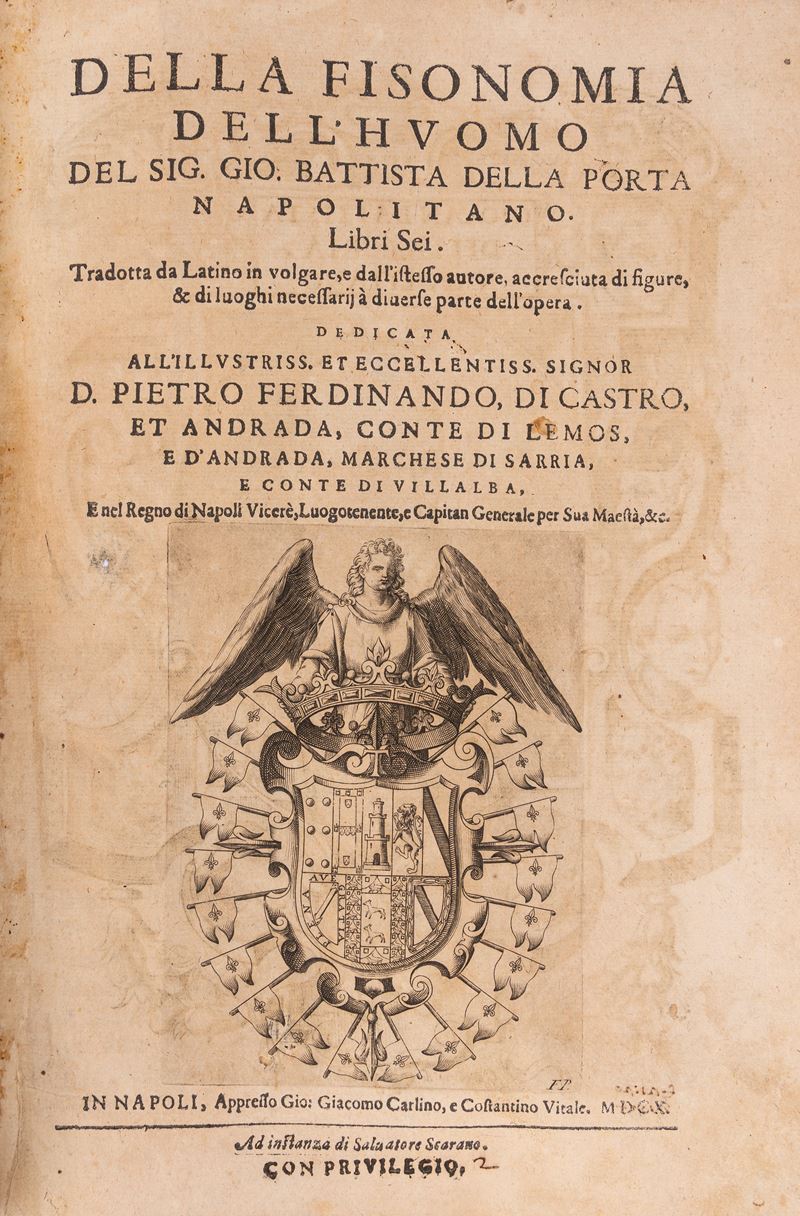 Napoli, Giovanni Giacomo Carlino & Costantino Vitale, 1610. In 2°. Stemma inciso in rame al frontespizio e ritratto dell'Autore al verso entro cornice con esempi di fisionomie umano/animalesche, ad a3 ritratto del dedicatario, numerose incisioni in rame nel testo, lievi arrossature e fioriture, alcuni tarli, legatura coeva in pergamena rigida, alcuni restauri e difetti. Custodia in cartone rigido beige. Ex libris cartaceo al contropiatto.