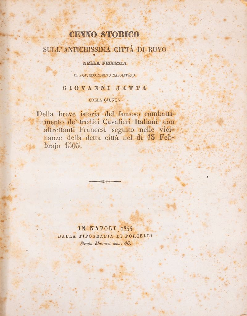 Cenno storico sull'antichissima Città di Ruvo nella Peucezia - Historia del combattimento de' tredici Cavalieri Italiani con altrettanti Francesi fatto in Puglia tra Andria e Quarati, 1844