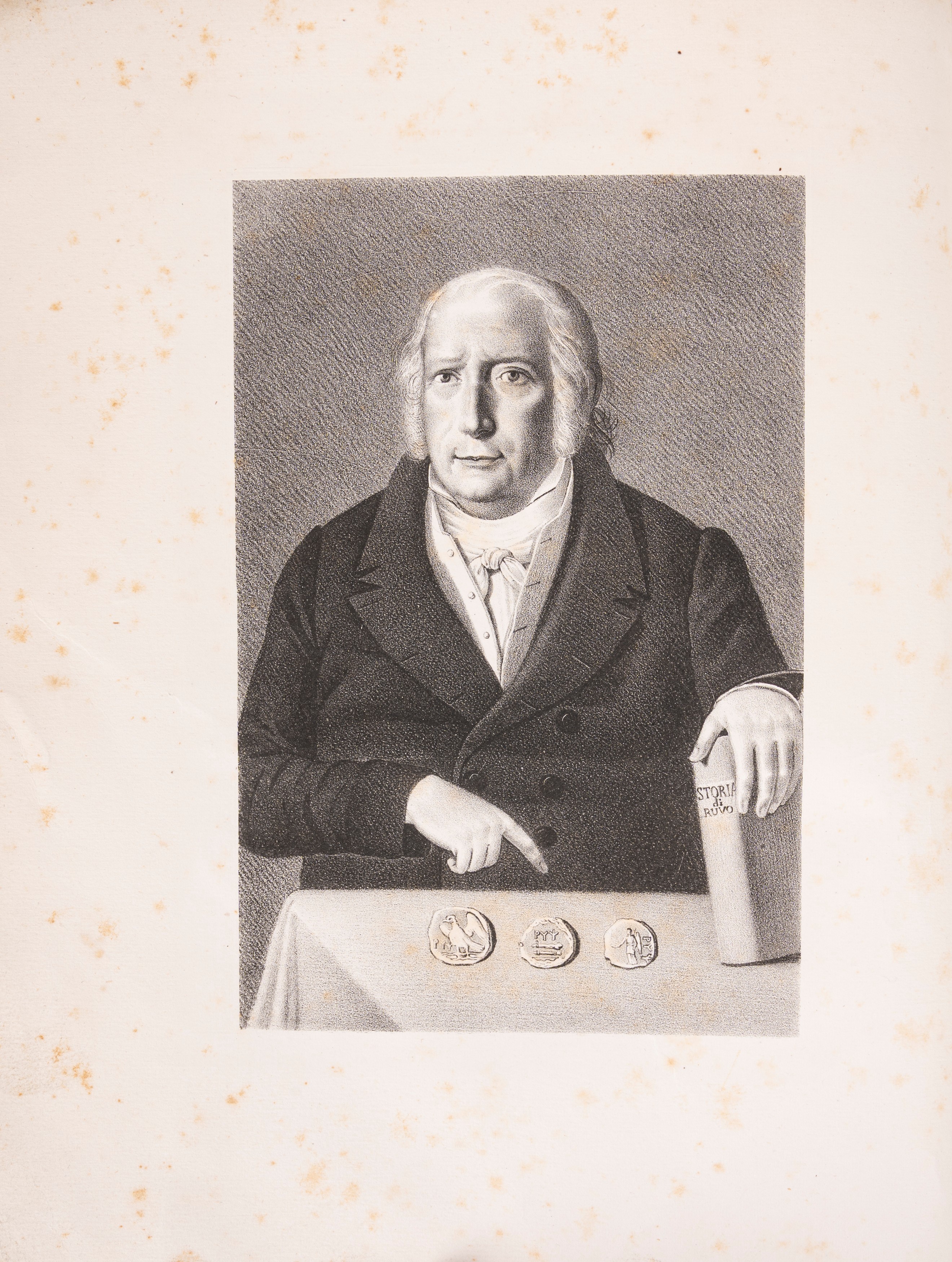 Napoli, Tipografia di Porcelli, 1844. In 2°, 285 x 235 mm. Ritratto dell'autore in antiporta, due tavole fuori testo raffiguranti monete, marginali fioriture, ESEMPLARE IN BARBE, legatura moderna in mezza pergamena e cartone marmorizzato.