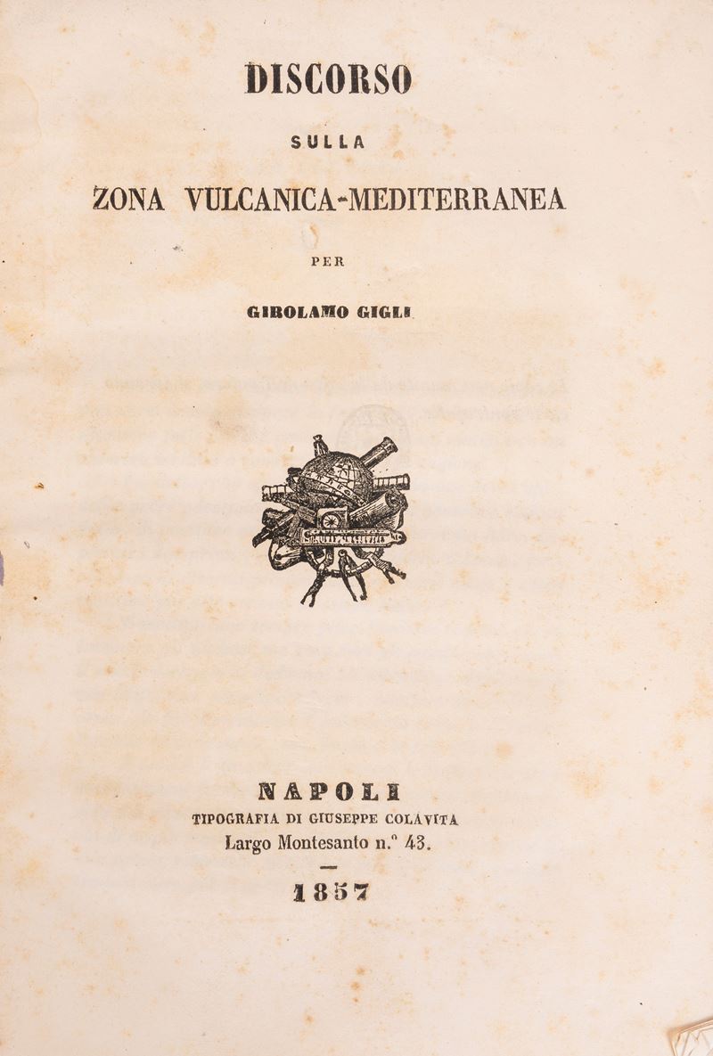 Napoli, Giuseppe Colavita, 1857. In 8°. Fregio xilografico al frontespizio, lievi fioriture, brossura editoriale (piccole mancanze e difetti) entro legatura in mezza tela con angoli e carta marmorizzata, titolo in oro al dorso. § Gatta, L. L'Italia sua formazione suoi vulcani e terremoti. Milano, Hoepli, 1882. In 8°. Con numerose tavole, alcuni fascicoli allentati, brossura editoriale con titolo in rosso e nero, difetti al dorso, segni d'usura.