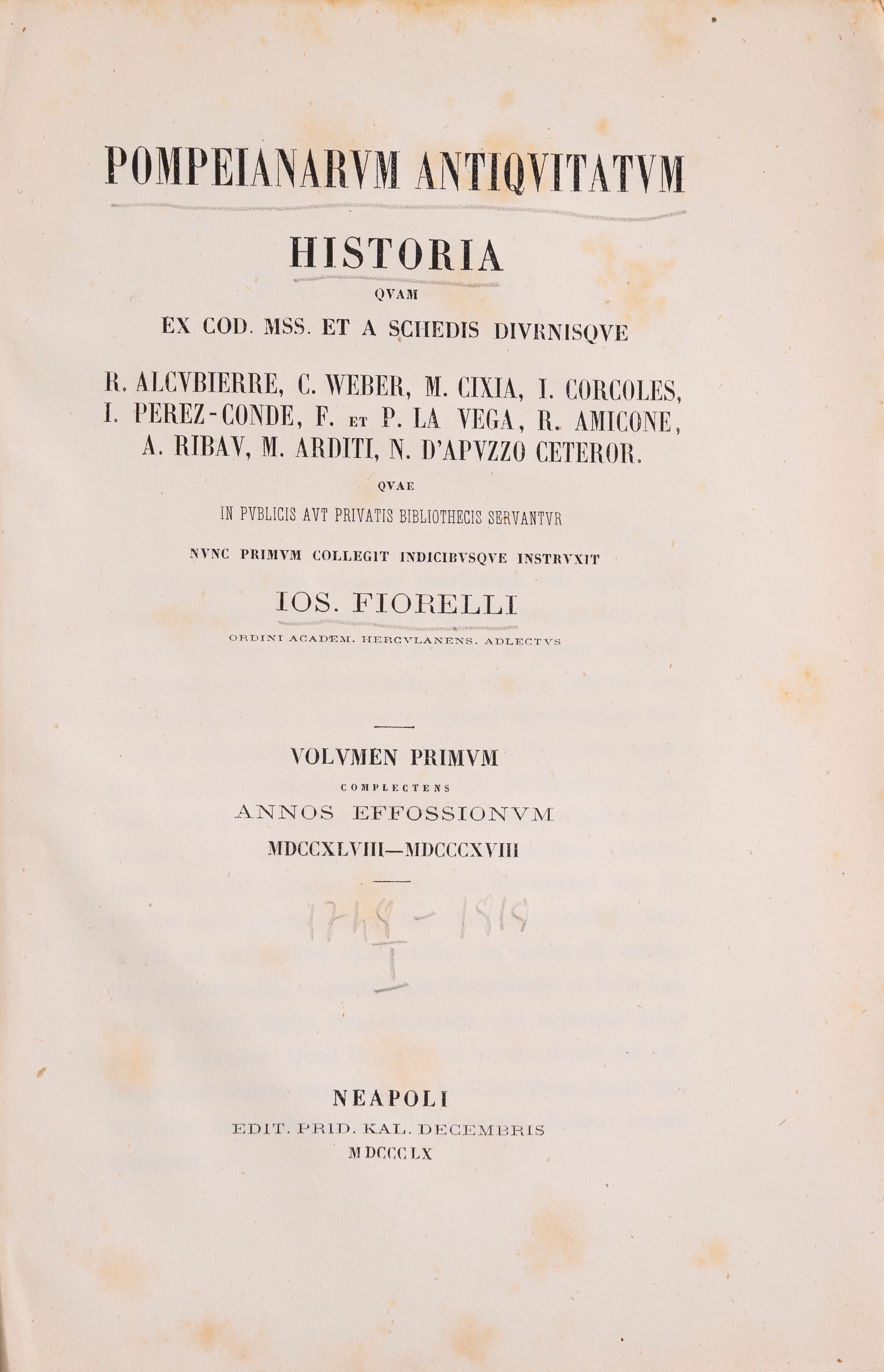 Interessante studio del celebre archeologo e direttore degli scavi di Pompei Giuseppe Fiorelli (Napoli, 1823–1896). Fiorelli fu una delle figure centrali dell’archeologia italiana dell’Ottocento, legando il suo nome soprattutto agli scavi di Pompei. Nominato direttore nel 1860, introdusse criteri di scavo moderni e sistematici, ancora oggi alla base dell’organizzazione del sito. Celebre è l’invenzione della tecnica dei calchi in gesso, che permise di restituire le forme delle vittime dell’eruzione del 79 d.C. Promotore della divulgazione scientifica e dell’apertura degli scavi al pubblico, Fiorelli contribuì in modo decisivo alla nascita dell’archeologia moderna e alla valorizzazione del patrimonio archeologico nazionale.
