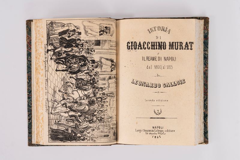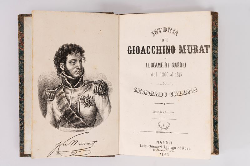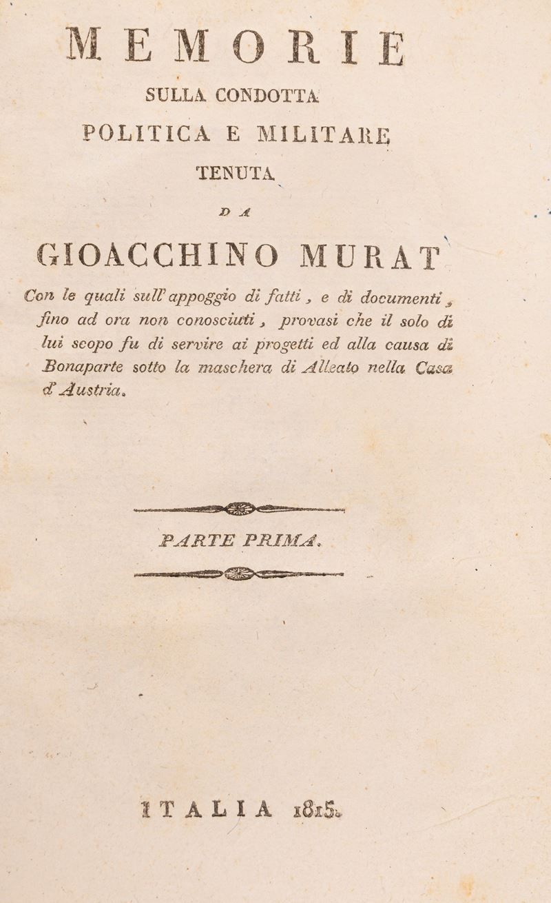 Napoli, Luigi Chiurazzi Librajo-editore, 1862. 3 voll. in un tomo, In 4°. Ritratto di Gioacchino Murat in antiporta. Legatura in mezza pelle verde e piatti marmorizzati. § Memorie sulla condotta politica e militare tenuta da Gioacchino Murat, Real Tipografia Militare, 1815. In 8°. Legatura in mezza pelle verde con angoli e piatti marmorizzati.