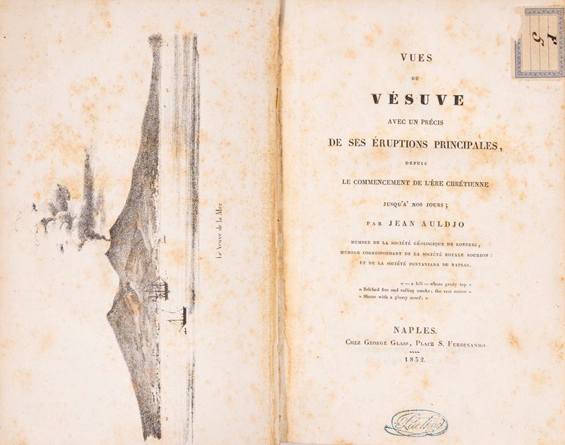 Napoli, George Glass, 1852. In 8°. In antiporta tavola che descrive il Vesuvio dal mare, numerose tavole, di cui una di grandi dimensioni, lievi difetti. Legato con Gigli, Girolamo. Discorso sulla zona vulcanica-mediterranea, Napoli, Giuseppe Colavita, 1857. Legato con Sasso, Camillo Napoleone. Il Vesuvio Ercolano e Pompei, Napoli, Federico Vitale. 1857. Con una tavola ripiegata. Legato con Le Hon, H. Histoire complète de la Grande eruption du Vesuve de 1631. Bruxelles, Hayez, 1865. Qualche arrossatura e fioritura, legatura coeva in mezzo marocchino, titolo in oro al dorso liscio, spellature, lievi difetti.