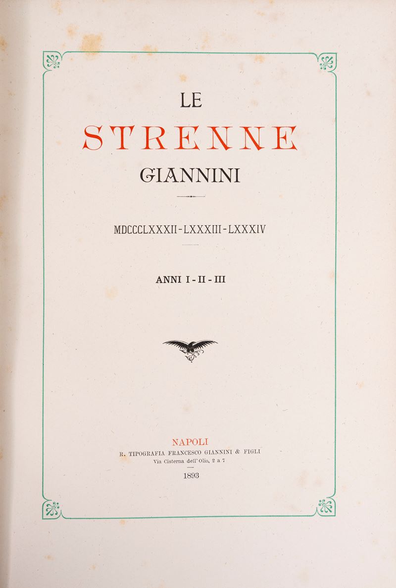 Insieme di 3 strenne stampate a Napoli dalla Tipografia Giannini tra il 1892 e il 1894. In 8 grande. Con numerose tavole nel testo, testo inquadrato da cornice, alcune fioriture e arrossature, legature posteriori in mezza pergamena con angoli e carta marmorizzata, titolo in oro al dorso.