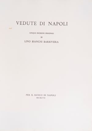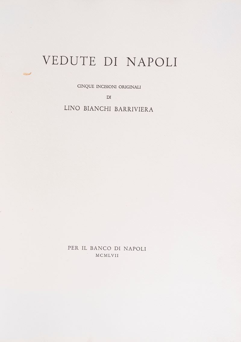 Napoli, 1957. In folio. Cartella editoriale in cartone con titolo impresso al piatto anteriore contenente due bifogli di testo e 5 acqueforti di Lino Bianchi Barriviera (campo inciso cm 27x38), ciascuna protetta da velina e firmata a matita in basso a destra e titolata, firmata e datata nella lastra in basso a sinistra, rare e lievissime fioriture.