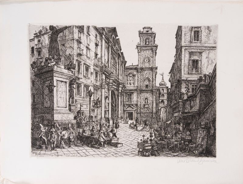 Unica edizione di pregio per la nitidezza e la qualità del disegno e la tecnica d'incisione al torchio su carta fabbricata a mano. Ne furono tirati pochissimi esemplari e fu esclusa l'ipotesi di ogni futura tiratura per via delle enormi difficoltà incontrate. Le tavole presenti: Scavo della necropoli a Pompei; Il Monte di Pietà, San Lorenzo Maggiore, Museo di Capodimonte e l'edificio della Mostra d'Oltremare a Napoli.