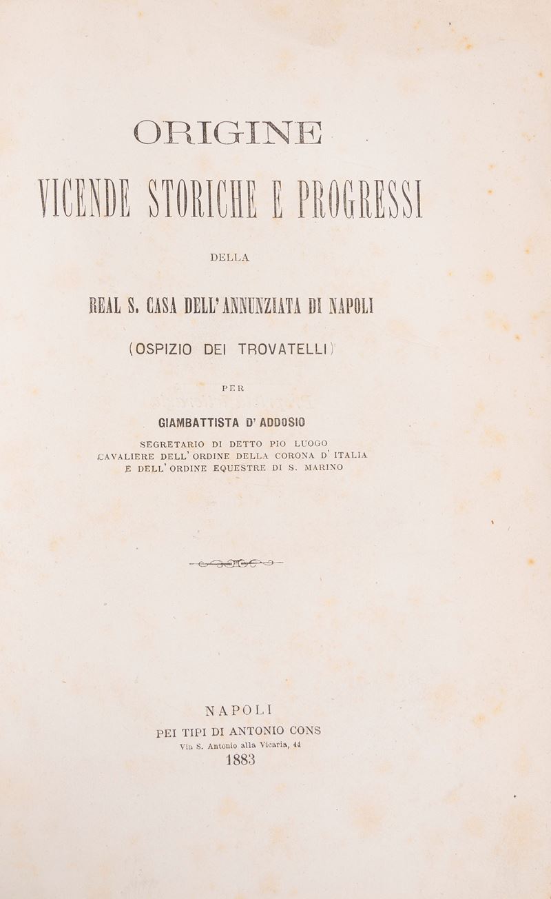 Napoli, Tipografia di P. Tizzano, 1847. In 8° grande, 4 tomi in 2 voll. Tavole fuori testo, fioriture, legature coeve in mezza pelle marrone e cartone. § Giambattista D'Addosio. Origine Vicende storiche e progressi della Real S. Casa dell'Annunziata di Napoli. Napoli, Antonio Cons, 1883. In 4°. Legatura in mezza pergamena e tela scura.